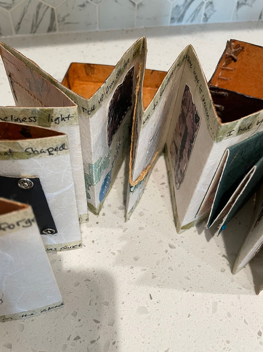 The box was cut our of heavy Bristol board and covered in brown paper recalling the ground we so firmly walked on while in New Mexico. the inside of the box was covered with tissue paper of dragon flies. The box is stitched together with a heave hemp thread and then waxed to create a matted sheen. The book is an accordion that you pull out of the box to read the book. The pages hold items collated on the trip that have been hand sewn on onto the pages.